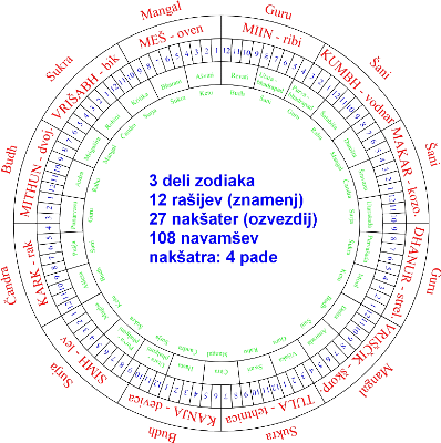 * vsako izmed 27-ih ozvezdij pa še na 4 manjše dele/pade (dobimo jih 108)